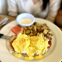 My friends and I went on a girls trip to San Diego, and couldn't decide where to go to breakfast in La Jolla. We stumbled across The Cottage on Yelp and wow, we are so glad we did. Everything was outstanding. Despite coming on a busy Sunday morning, we were seated quite quickly (around 35 minutes). Our table was indoors, with an extremely comfortable and welcoming environment. Every staff member we spoke to was knowledgeable and friendly, without being over the top. Everything we ate and drank exceeded our expectations. For drinks, we had fresh watermelon juice and café au laits. The café au lait was served in a large mug, and was delicious. As for food, two of us had the pork belly Benedict, and one of us had an amazing braised beef hash. We also got the fresh baked buttermilk scone and lemon ricotta pancakes to share. The buttermilk scone was incredible. Served warm with a sugar top, butter, and strawberry jam. It wasn't as dense as a typical scone, and I would almost call it a biscuit. I would drive back here from Orange County during peak traffic to have that scone again. In summary, our experience at The Cottage set up a wonderful start to the day. I can't wait to return with my boyfriend and treat him to the meal I've been raving about to him for the past week.
